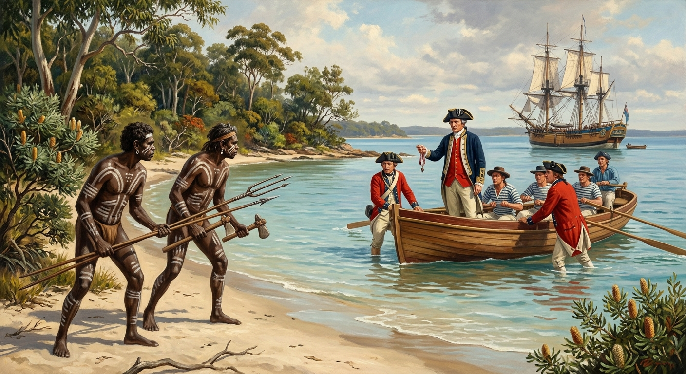 Док су се чамци приближавали копну, Кук је забележио присуство локалног становништва. Двојица ратника народа Гвеагал стајала су на стенама, наоружани копљима, пружајући отпор непознатим посетиоцима који су израњали из морске пене. Био је то кратак, напет тренутак неспоразума; Кук је испалио неколико хитаца из мускете изнад њихових глава како би осигурао искрцавање. Тај први додир, иако пролазан, био је увод у сложену и често трагичну историју односа између колонијалних сила и староседелаца, чија је култура на том истом песку трајала десетинама хиљада година пре појаве британског једра.