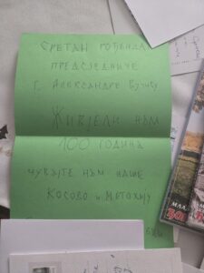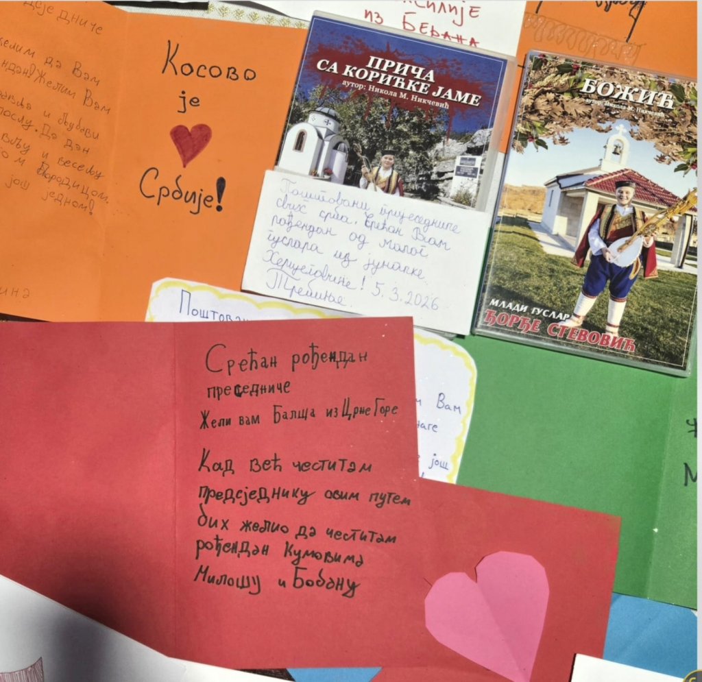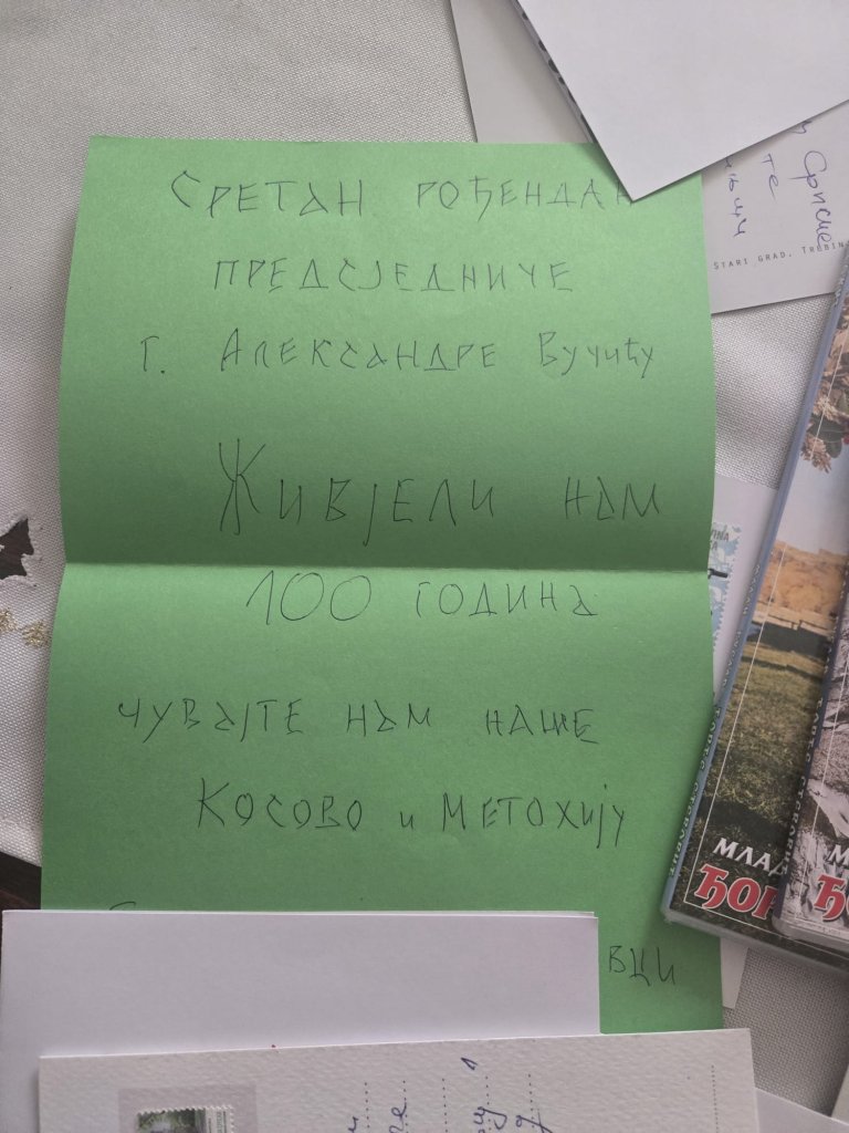 Посебну емоцију носе аутентичне дечје реченице: „Срећан рођендан нашем председнику“, „Желимо Вам здравље, срећу и љубав“, „Да 100 година славите“, али и поруке попут „Чувајте нам Косово и Метохију“ и „Косово је срце Србије“. У једној од честитки стоји и жеља: „Да до године славите у Призрену“. Ове једноставне речи сведоче о томе како најмлађи доживљавају државу, традицију и национални идентитет.