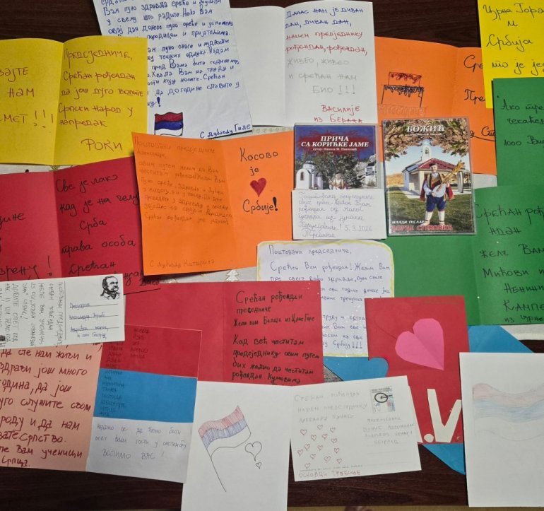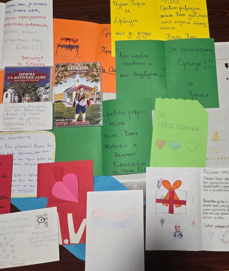 Поводом рођендана председника Републике Србије Александра Вучића, стигле су бројне руком писане честитке деце из Републике Српске и Црне Горе. Украшене срцима, тробојкама и дечјим цртежима, исписане крупним словима и искреним речима, ове честитке носе једноставне, али снажне поруке – жеље за здравље, снагу, мудрост и успех у вођењу државе. У њима нема протокола, већ само чиста дечја емоција и осећај припадности.